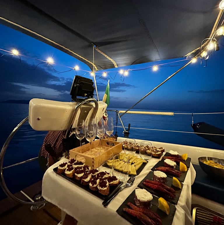 We will cast off an hour before sunset to reach the most sheltered bay from the wind in Favignana or Levanzo. This way, we will enjoy a magical aperitif while witnessing, from the front row, the sweet kiss between the sun and its beloved sea.
